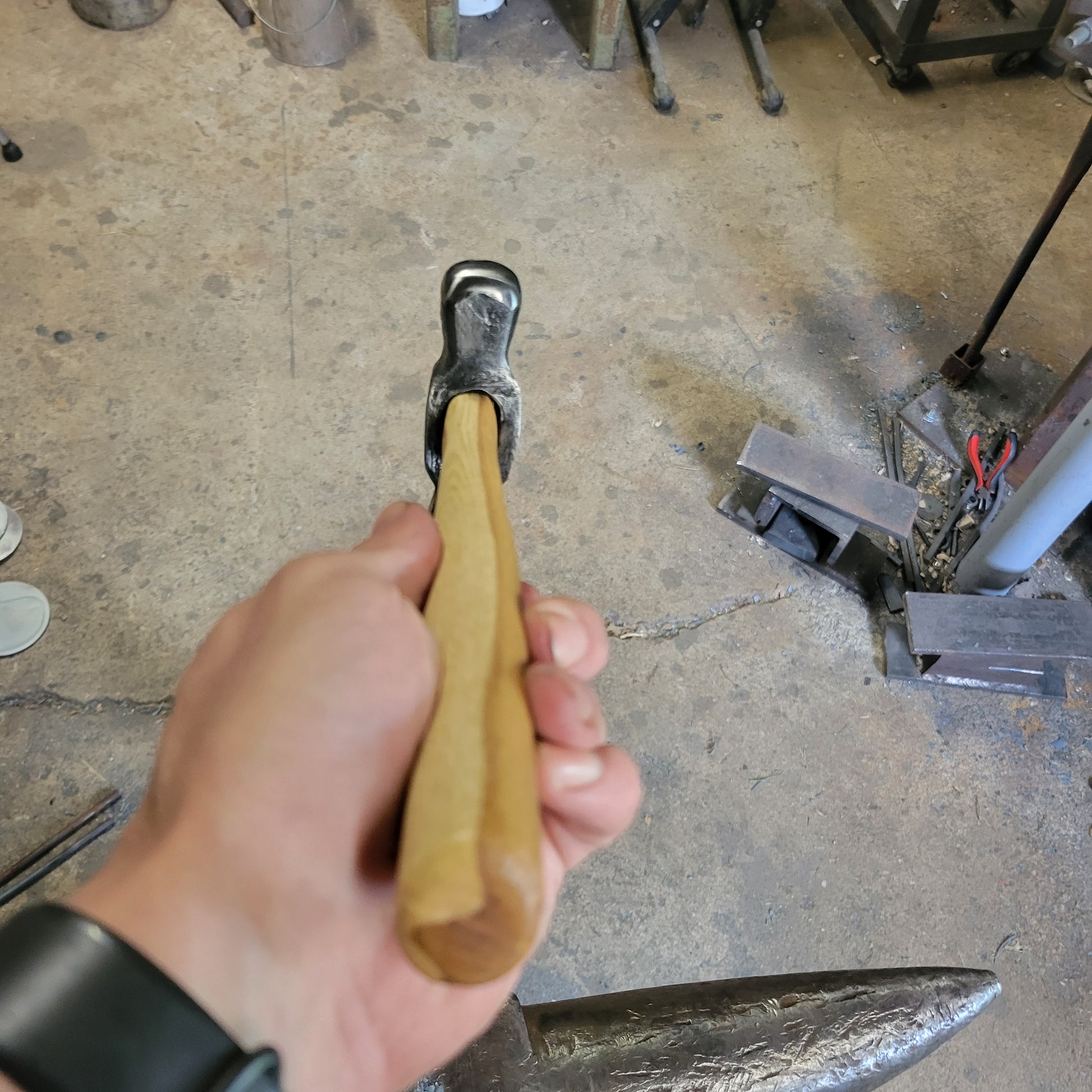 This ball peen hammer is made from an old forklift tine and a rough cut piece of ash, which is harvested 15 minutes from my shop. Total weight with handle is 524 grams/ 1.15lbs. handle length is 10". Head from face to face is about 4". Both handle and head has been treated with linseed oil.