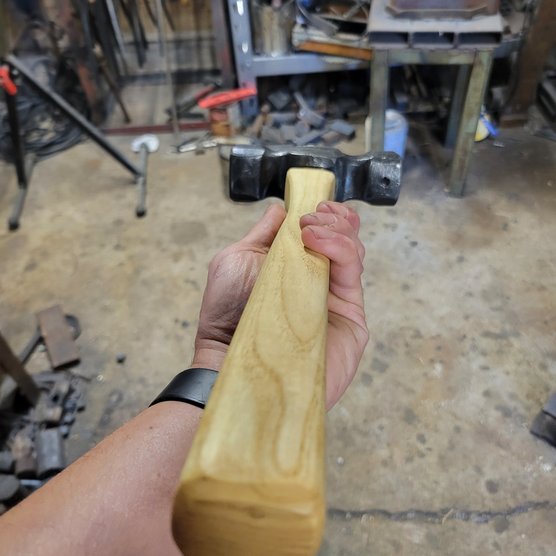 This rounding hammer is made from an old forklift tine and a rough cut piece of ash, which is harvested 15 minutes from my shop. Total weight with handle is 1.77kgs / 3.9lbs. handle length is 15". Head from face to face is about 5 1/4". Both handle and head has been treated with linseed oil.