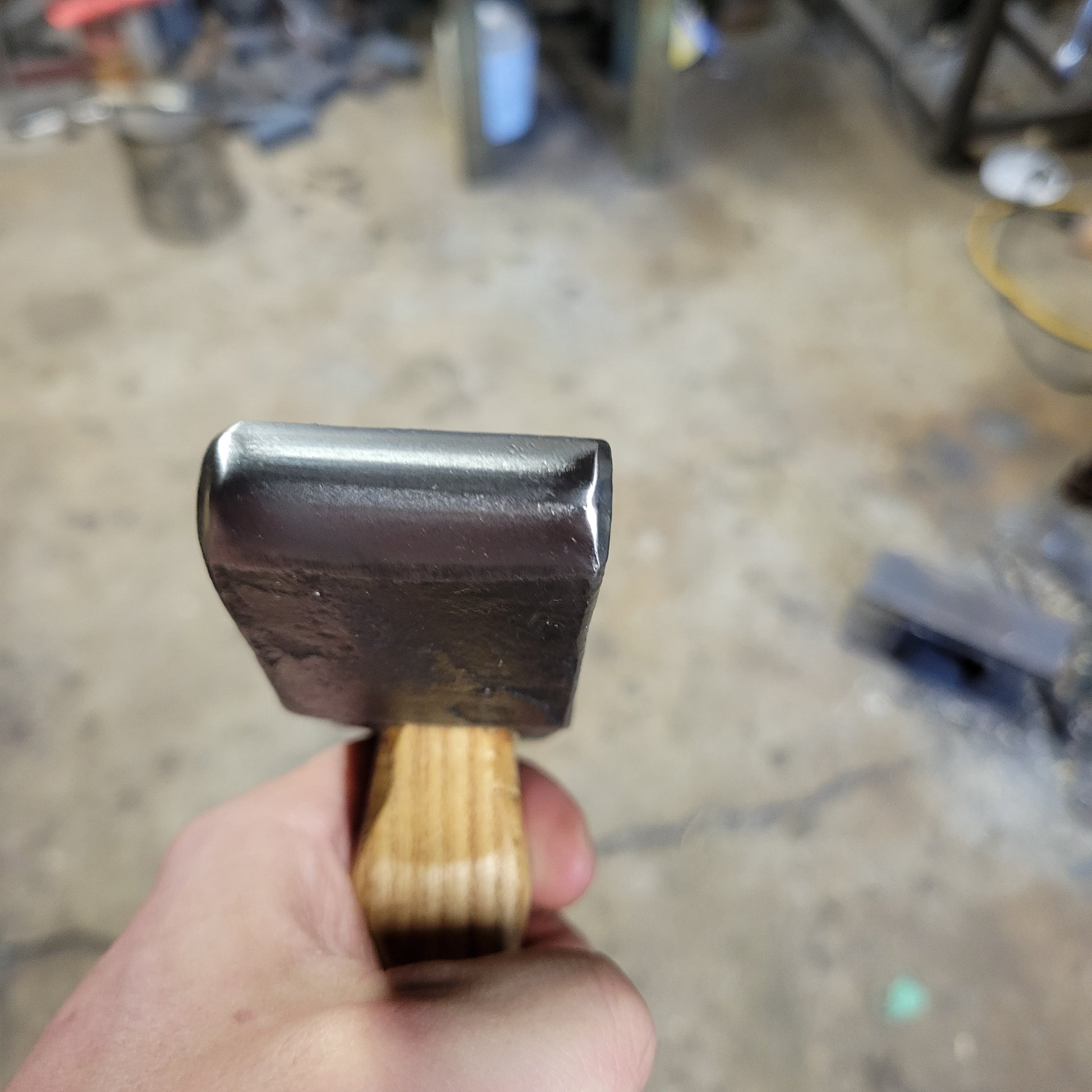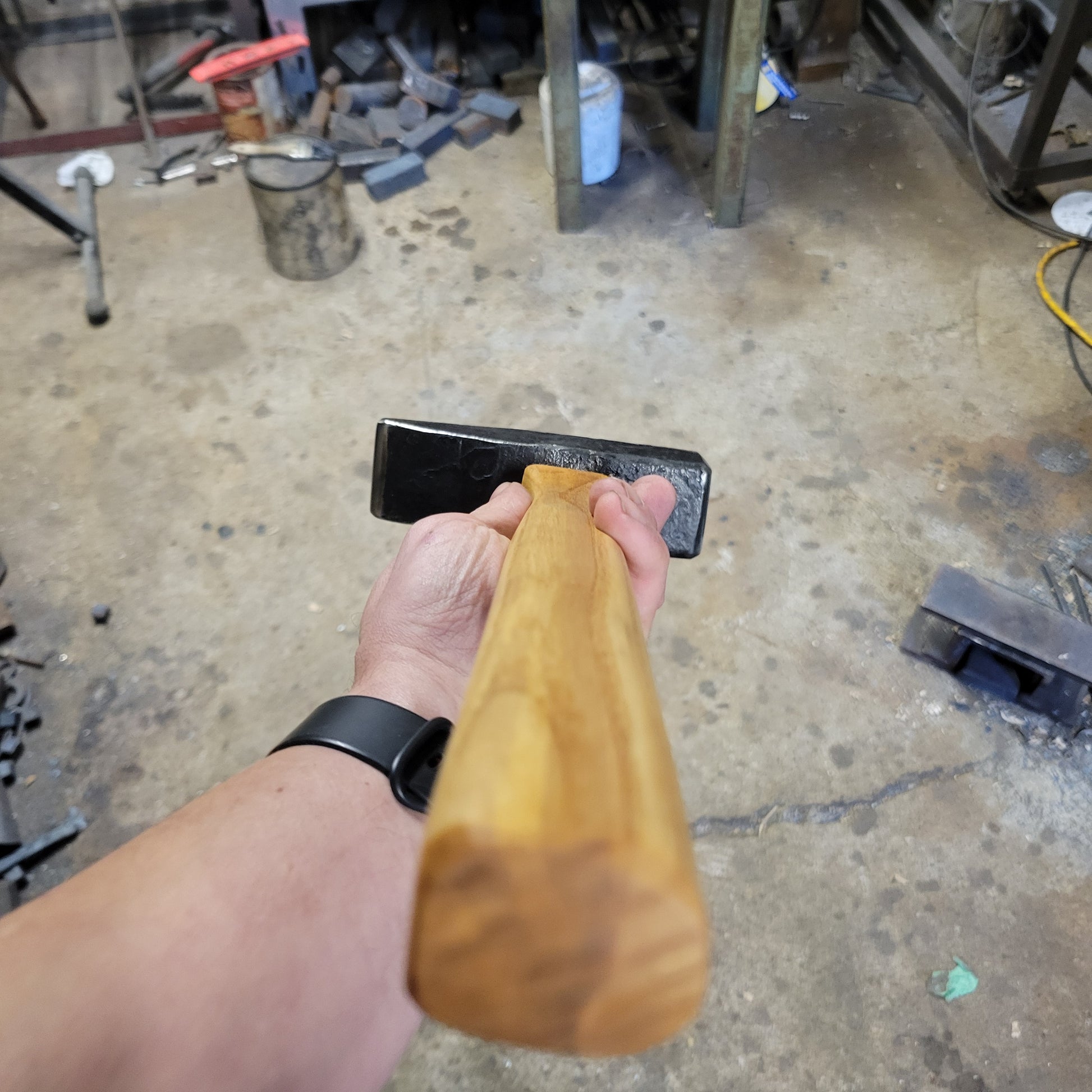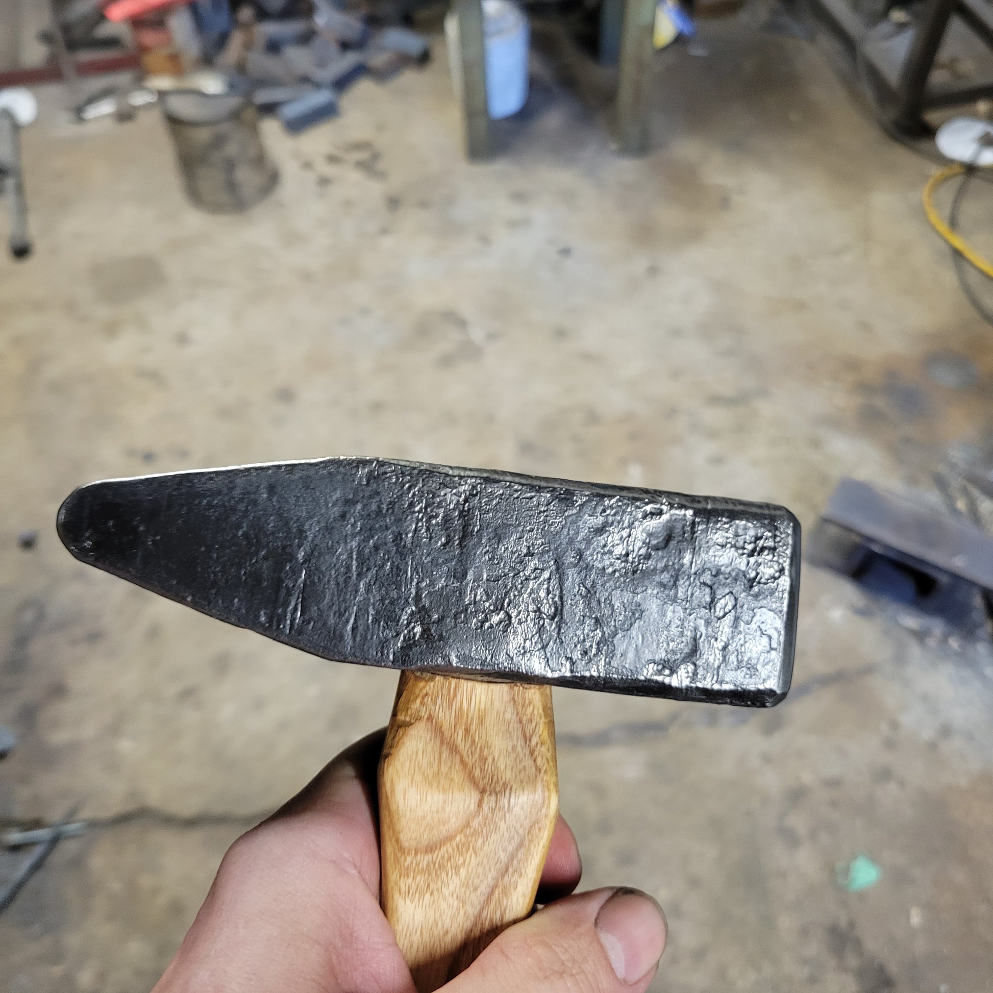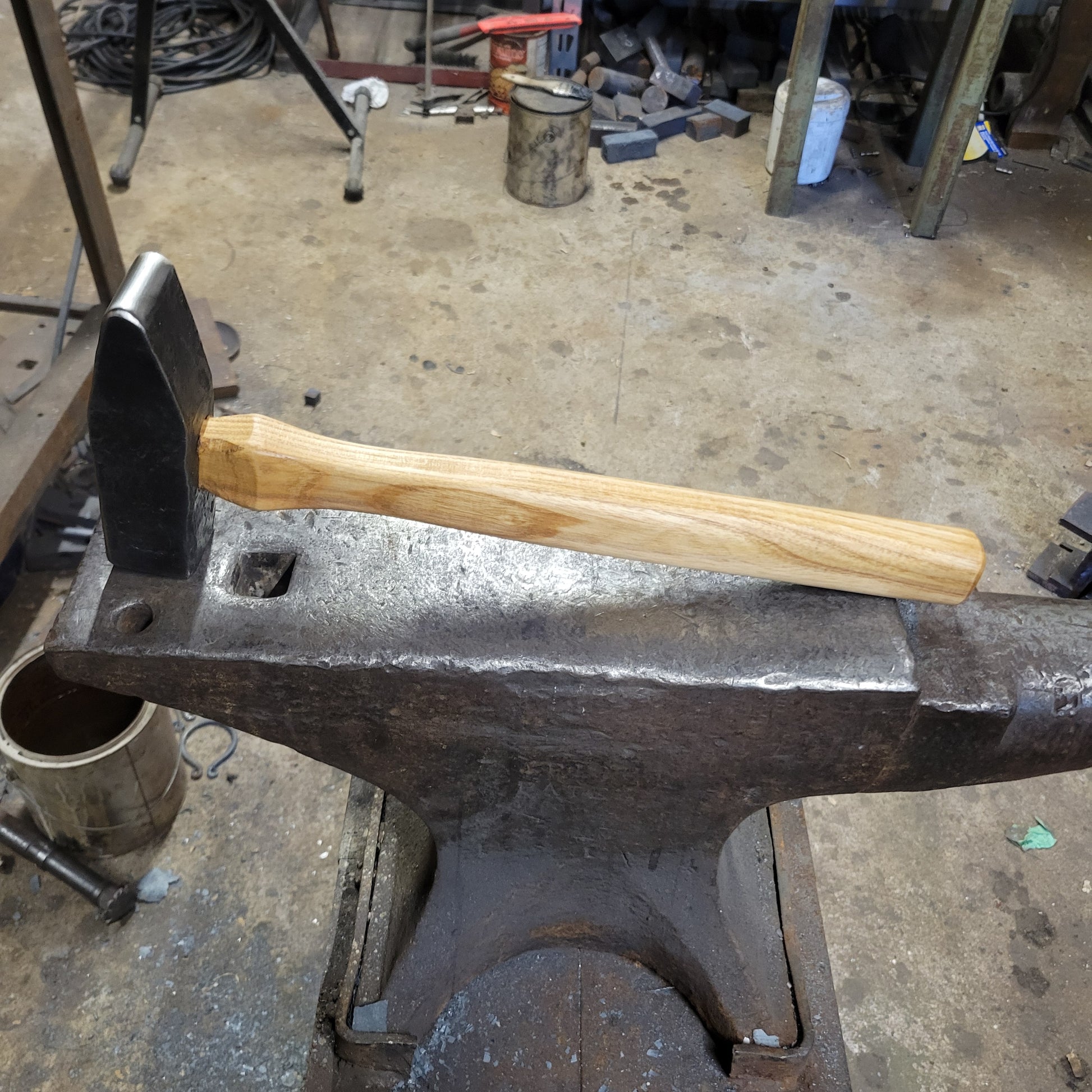 This Cross peen hammer is made from an old forklift tine and a rough cut piece of ash, which is harvested 15 minutes from my shop. Total weight with handle is 1.75kgs / 3.88lbs. handle length is 15". Head from peen to face is about 5 3/4". Both handle and head has been treated with linseed oil.