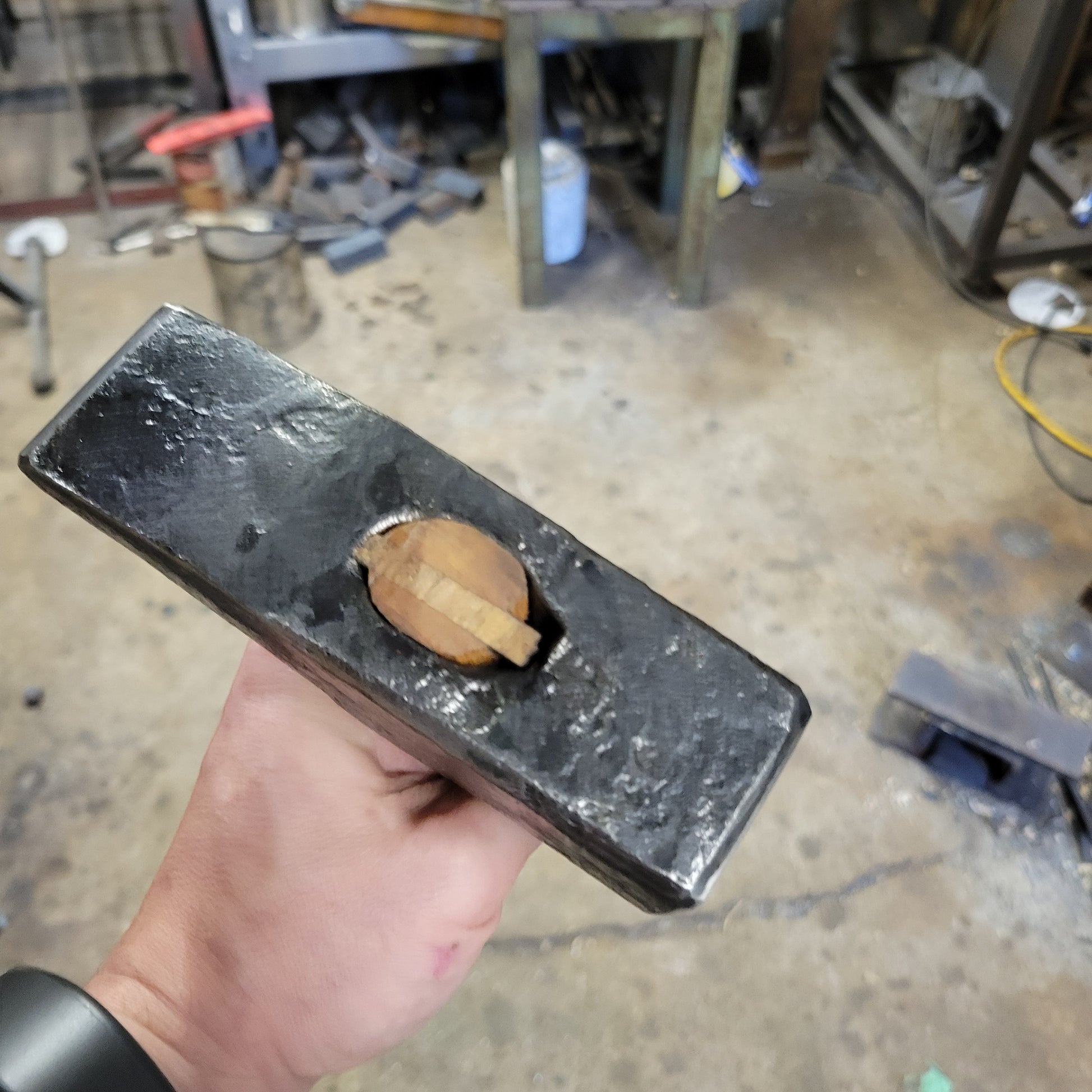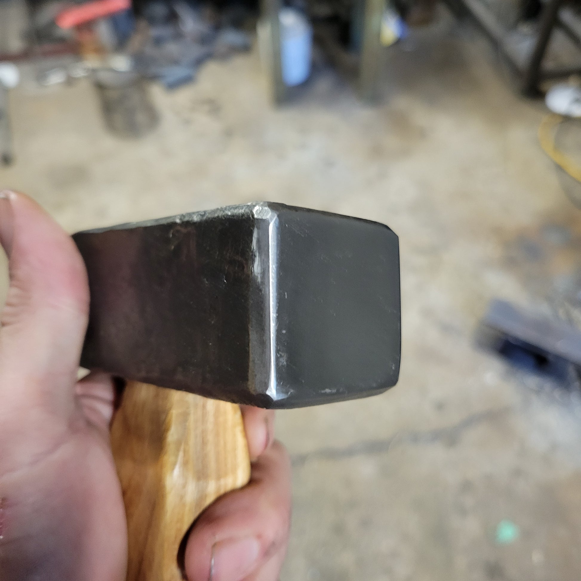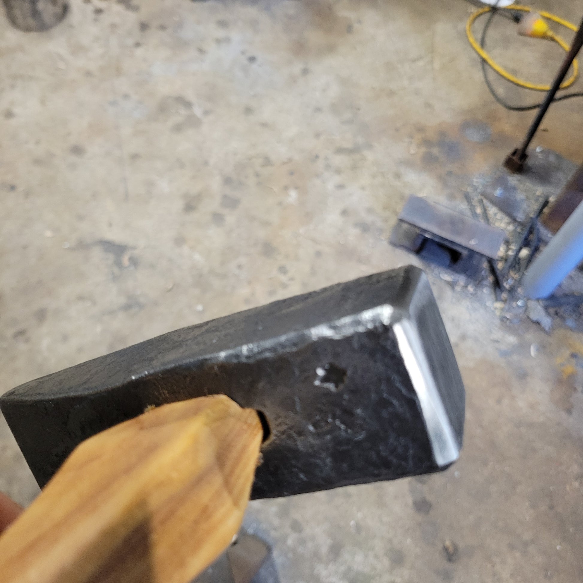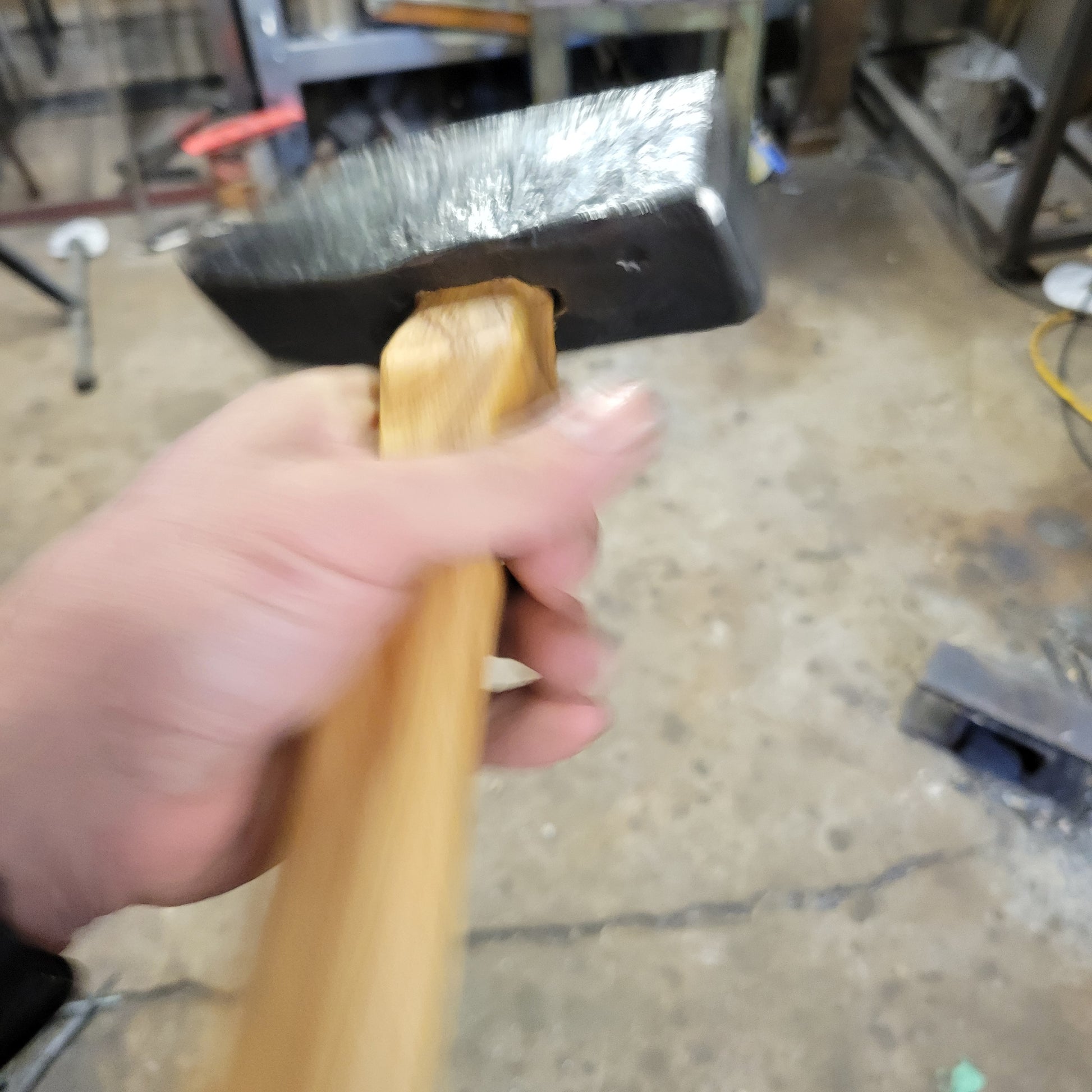 This Cross peen hammer is made from an old forklift tine and a rough cut piece of ash, which is harvested 15 minutes from my shop. Total weight with handle is 1.75kgs / 3.88lbs. handle length is 15". Head from peen to face is about 5 3/4". Both handle and head has been treated with linseed oil.