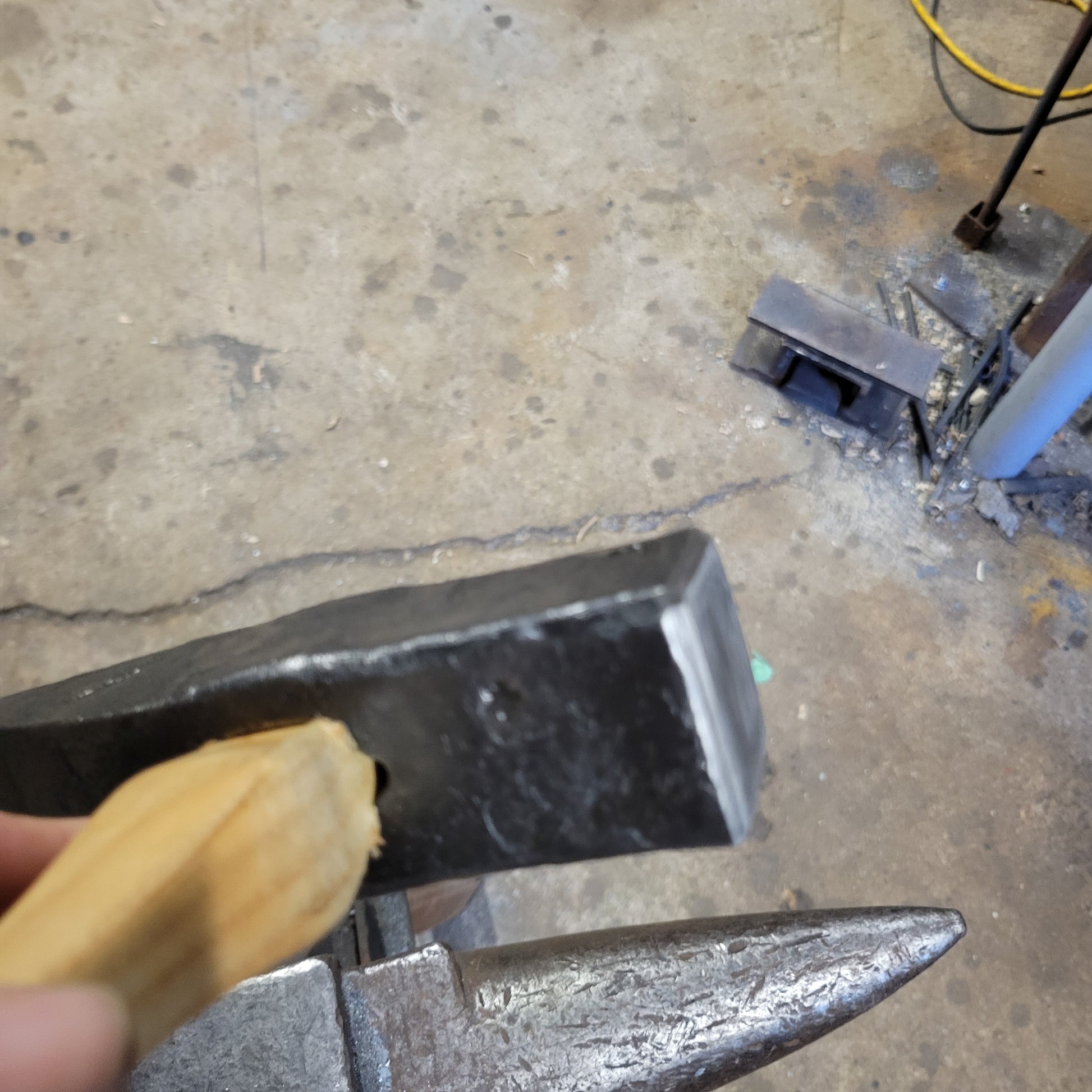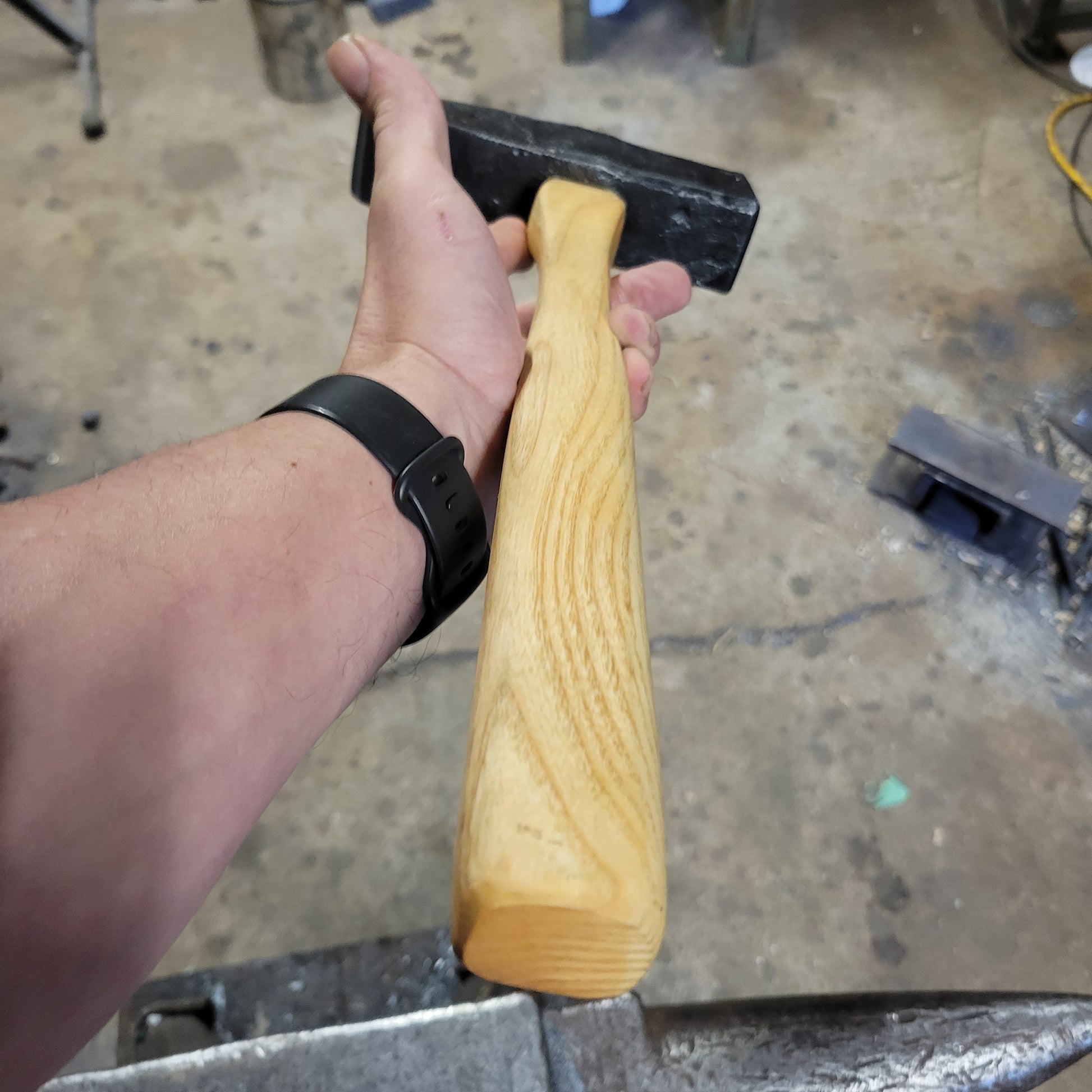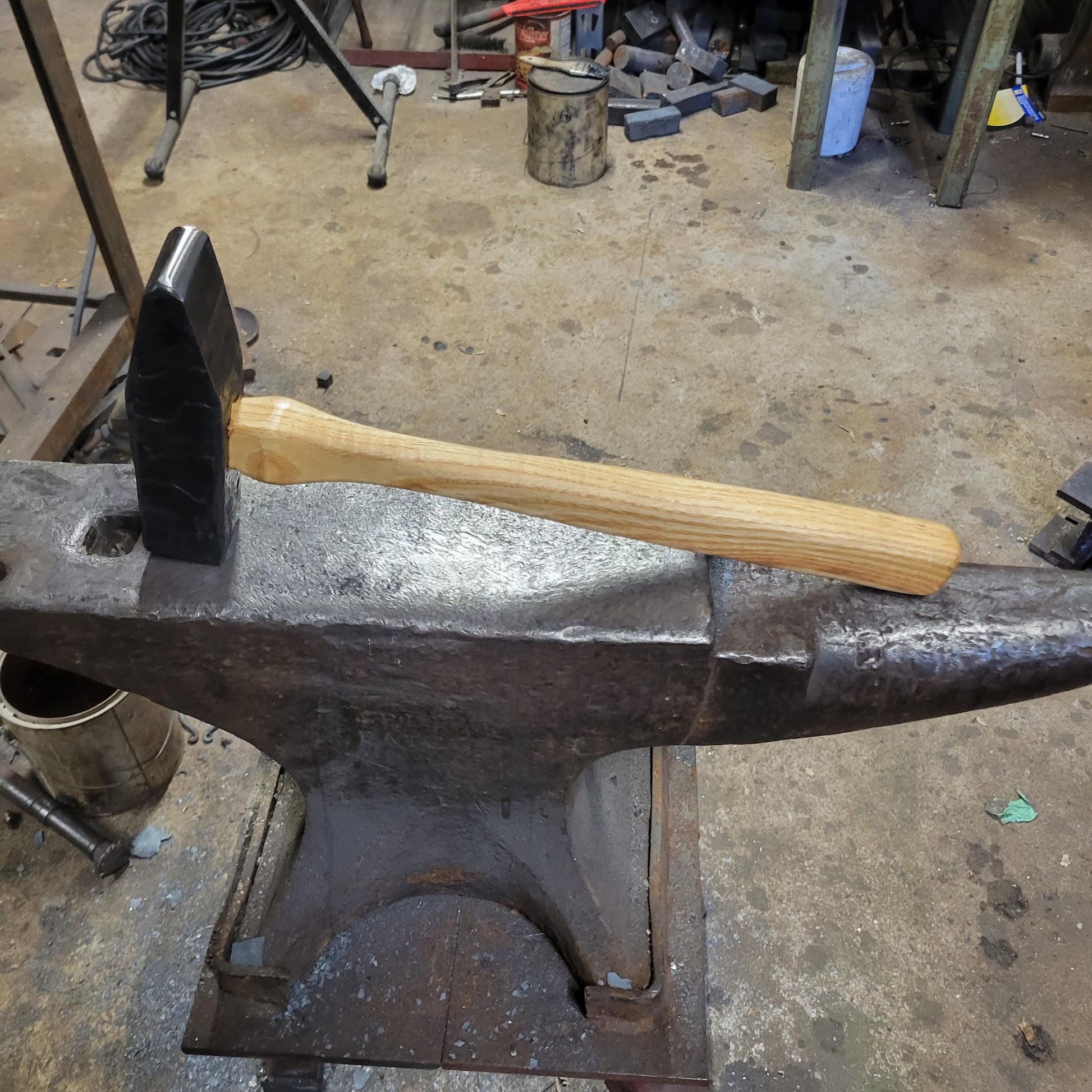 This Cross peen hammer is made from an old forklift tine and a rough cut piece of ash, which is harvested 15 minutes from my shop. Total weight with handle is 1.9kgs / 4.19lbs. handle length is 15". Head from peen to face is about 6 3/8". Both handle and head has been treated with linseed oil.
