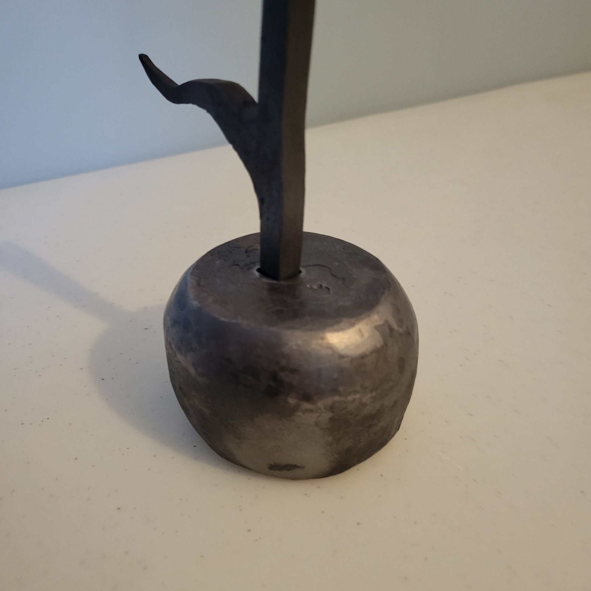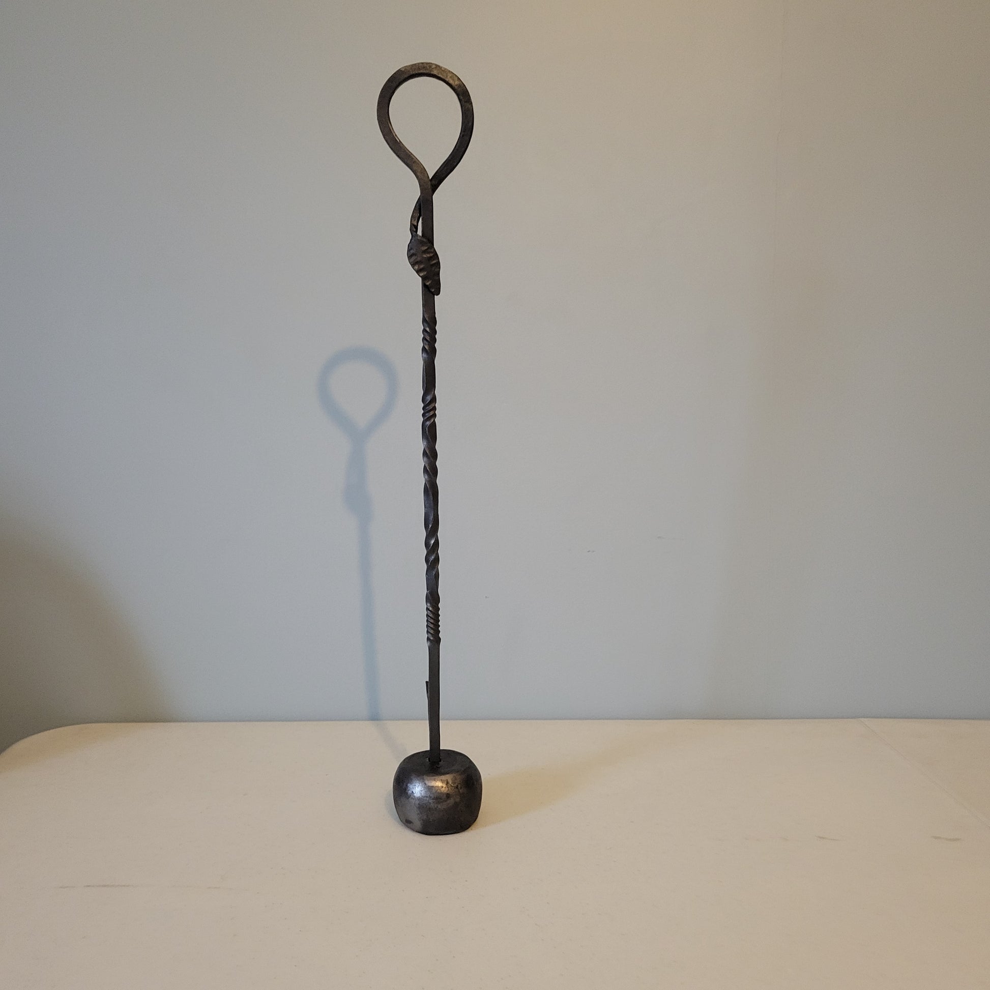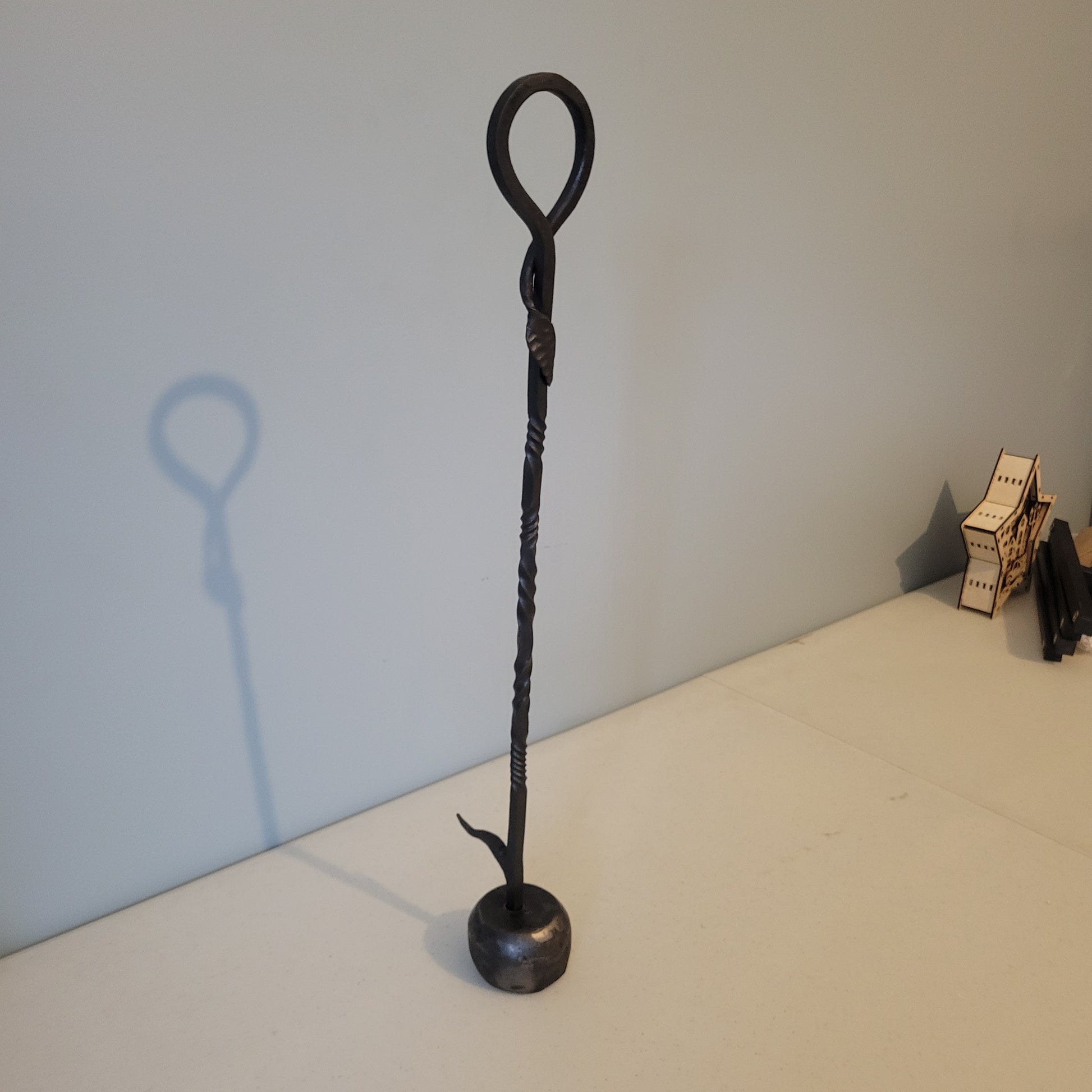 This hand forged fire poker stand alone. The fire poker is made from 5/16" steel and feature a little leaf and twisted through out, and is 24" long. The stand is made from a round chunk of steel that had been squeezed in my forging press to create a slight almost apple shape affect. Both fire poker and stand is treated with linseed to help prevent rusting.