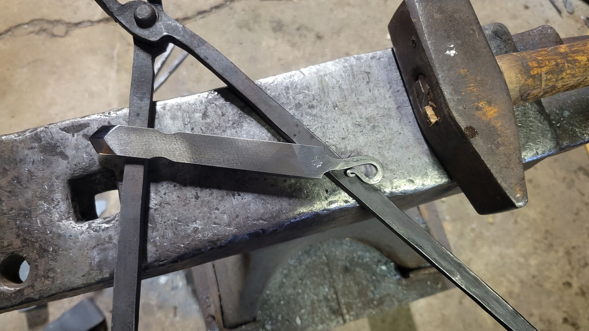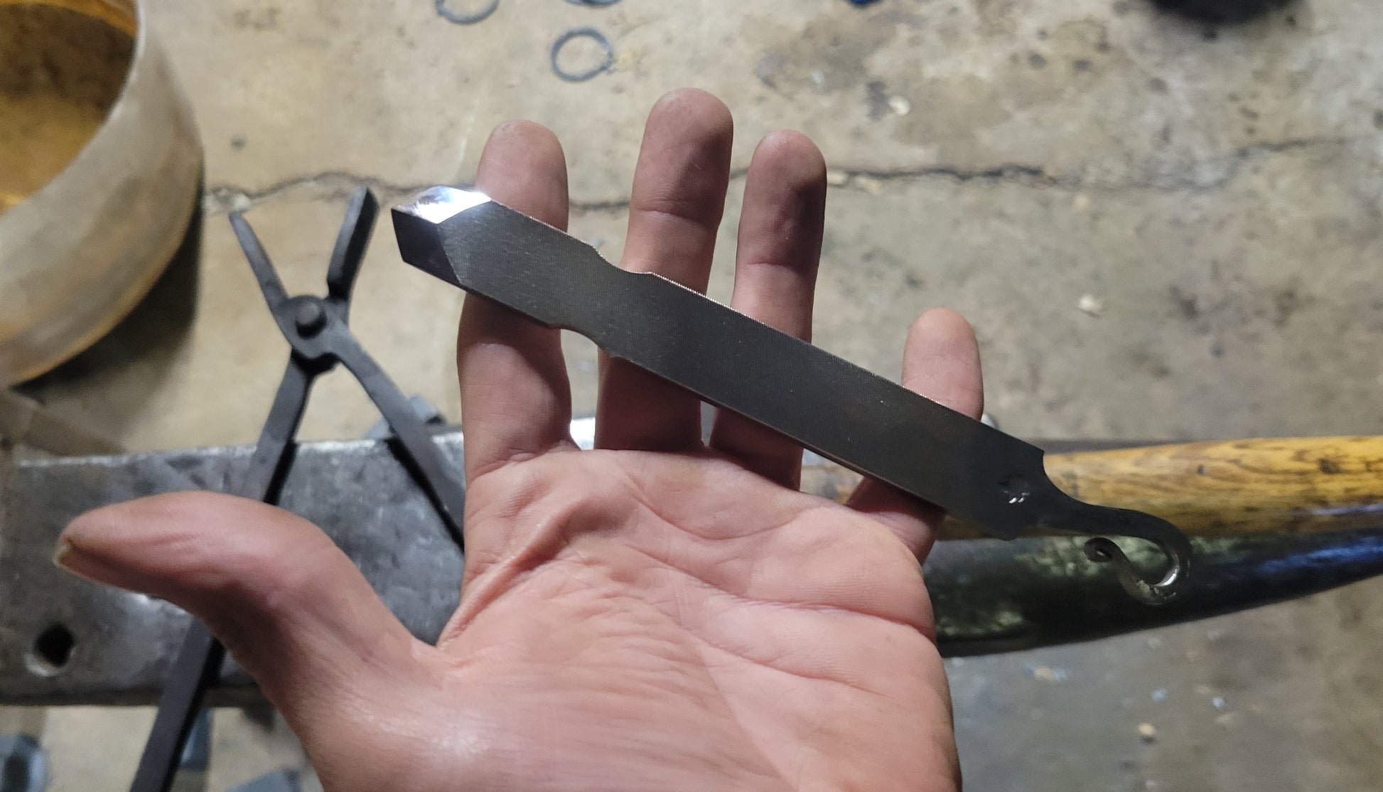 Features a forged loop on the end to hang on the wall so it can be kept in arms reach right at your work bench.